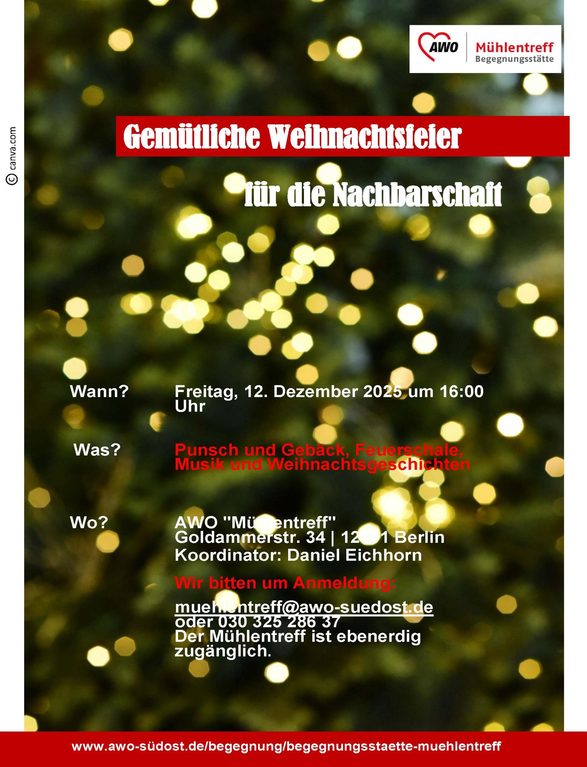 Unser Mühlentreff lädt ein zur gemütlichen Weihnachtsfeier für die Nachbarschaft, mit Feuerschale, Musik, Punsch und Gebäck. Herzlich willkommen! Um Anmeldung wird gebeten.