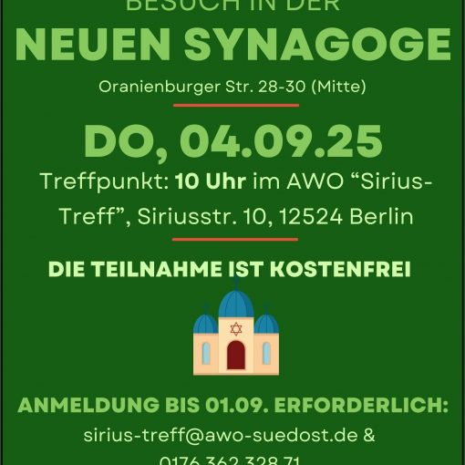 04.09.: Kulturausflug in die Neue Synagoge Die AG Kulturausflüge im „Sirius-Treff“ lädt herzlich ein zum gemeinsamen Besuch der Neuen Synagoge. Schließen Sie […]