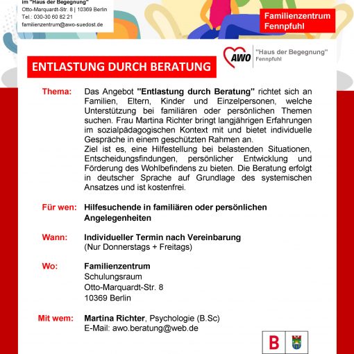Neues Angebot im Familienzentrum Fennpfuhl: Entlastung und Beratung Das Angebot „Entlastung durch Beratung“ richtet sich an Familien, Eltern, Kinder und Einzelpersonen, welche […]