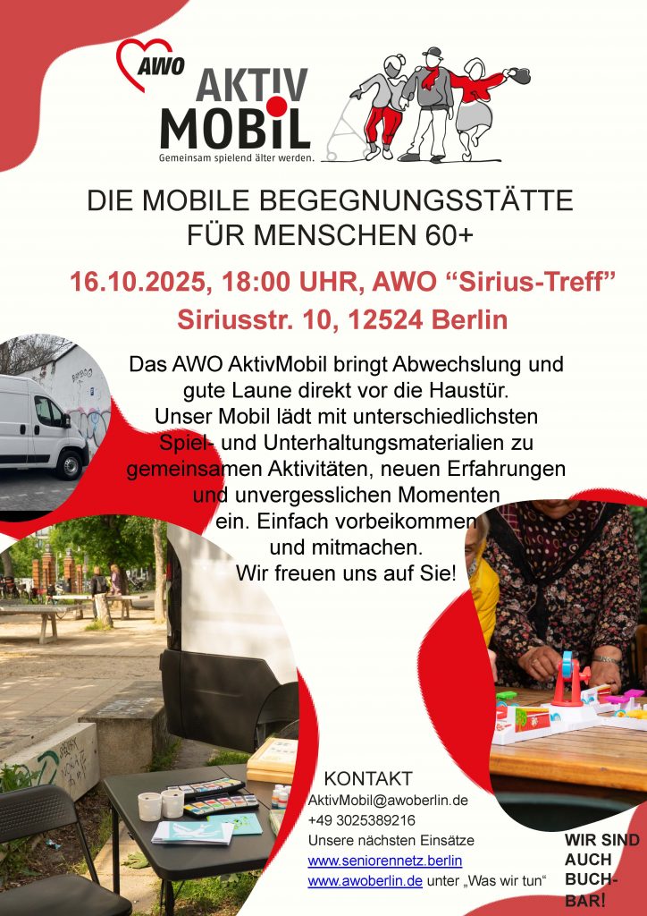Am Donnerstag, 16. Oktober, macht das AWO-Aktivmobil Station im „Sirius-Treff“. Die Mobile Begegnungsstätte für Menschen ab 60 Jahren bringt Abwechslung und Gute Laune direkt vor die Haustür. Herzliche Einladung!
