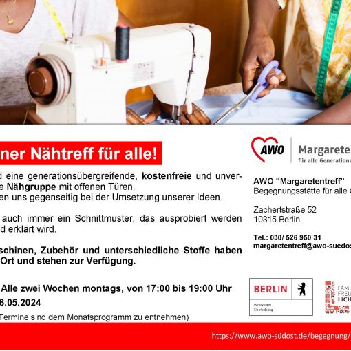 Wir bitten um Anmeldung telefonisch oder per E-Mail: Tel.: 030/ 526 950 31, margaretentreff@awo-suedost.de