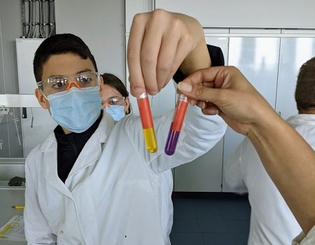 Chemiker*in für einen Tag: mit den Brückenbauern in der Lise-Meitner-Schule Chemiker*in für einen Tag: Nachdem am 02. September 2021 bereits der 8. Jahrgang der Hermann-von-Helmholtz-Schule die modernen Labore der Lise-Meitner-Schule nutzen und Glas schmelzen konnten, waren am 09. und 16. September nun die Jahrgänge 9 und 10 sowie die Willkommensklasse an der Reihe, die Lise-Meitner-Schule zu besuchen. Nachfolgend lest ihr den Erlebnisbericht einer Schülerin aus dem Öko-Nat Kurs des 10. Jahrgangs: „Am 16.09.2021 ging der Öko-Nat Kurs (gemeinsam mit weiteren Schüler*innen des 10. Jahrgangs und der Willkommensklasse) der Hermann-von-Helmholtz-Schule in die Lise-Meitner-Schule. Wir hatten die Möglichkeit, die Schule und dessen Labore zu erkunden. Vor der Lise-Meitner-Schule wurden wir höflich empfangen und haben einen Laborkittel und eine Schutzbrille bekommen. Anschließend wurden wir in zwei Gruppen aufgeteilt und sind dann in die Labore gegangen. In dem Labor haben wir zwei Versuche durchgeführt. Im ersten Versuch ging es darum unbekannte Indikatoren zu bestimmen. Es stellte sich heraus, dass es sich um die Indikatoren Methyl-Orange, Phenolphthalein, Lackmus und Bromthymolblau handelte. Bei dem zweiten Versuch mussten wir den Calciumgehalt von Milch bestimmen. Dies gelang uns mit Hilfe von 0.05 ml EDTA-Lösung, 90 ml destilliertem Wasser, einer Spatelspitze Calconcarbonsäure (C21H14N2O7S) und Natriumhydroxid (NaOH). Mir persönlich hat dieser Tag sehr gefallen, da wir viel Neues gelernt haben und ich es sehr interessant fand die unbekannten Indikatoren zu bestimmen.“ (Selin M./10.2) Das Projekt Brückenbauer der AWO Berlin Kreisverband Südost e.V. organisiert an der Integrierten Sekundarschule Hermann-von-Helmholtz in der Berliner Gropiusstadt Begegnungen zwischen potentiellen Arbeitgebern und den Schüler*innen der Schule. Dabei kooperieren wir auch mit dem Oberstufenzentrum für Naturwissenschaften Lise-Meitner, da an dieser Schule neben der Möglichkeit sein Abitur zu absolvieren auch die schulischen Ausbildungen zu den technischen Assistent*innen in den Fachrichtungen Biologie, Chemie und Physik angeboten werden. Außerdem hat die Lise-Meitner-Schule Angebote für Schüler*innen anderer Schulen in den Nachmittagsstunden und kann bei Versuchen z.B. für die MSA-Abschlussarbeit in den Laboren unterstützen. Anmelden können sich alle Interessierte unter https://www.sfz-berlin.de/. Weitere Termine für die Schüler*innen der Hermann-von-Helmholtz-Schule werden im zweiten Halbjahr folgen