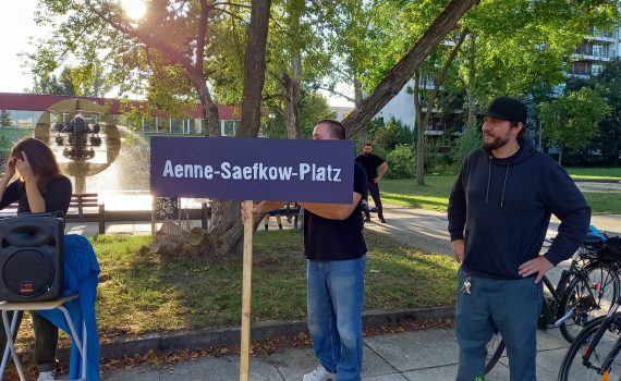Symbolische Platzbenennung im Fennpfuhl Am 19. September fand im Judith-Auer-Club eine ganz besondere Veranstaltung statt: Dank der Unterstützung der stellvertretenden Bezirksbürgermeisterin und Jugendstadträtin Camilla Schuler wurde ein nahegelegener Platz symbolische in „Aenne-Saefkow-Platz“ umbenannt. Aenne Saefkow war eine Widerstandskämpferin gegen das NS-Regime in Deutschland. Sie beteiligte sich an Widerstandsaktivitäten in der Berliner Arbeiterbewegung und gehörte zu den Aktiven rund um die kommunistische und antifaschistische Szene. Saefkow wurde nach dem Krieg als Vorbild des mutigen Engagements für Demokratie und Freiheit gewürdigt. Die Initiative zur Platzbenennung stammt von Kindern und Jugendlichen des Judith-Auer-Clubs. Die Jugendlichen des Jugendclubs setzten sich in den Sommerferien mit der Geschichte Lichtenbergs in der NS-Zeit auseinander und entwickelten daraus eine kreative Ausstellung. Unterstützt wurde diese Aktion vom AWO-Landesjugendwerk und der Fach- und Netzwerkstelle Licht-Blicke. Im Rahmen der Veranstaltung sprach Bezirksbürgermeister Martin Schäfer und erinnerte daran, die Vergangenheit nicht zu vergessen und sich gemeinsam für Demokratie einzusetzen. Musikalisch rundete der Berliner Künstler PTK mit einem Rap-Auftritt den Abend ab. Nach der symbolischen Platzbenennung richtet sich nun der Blick auf die Möglichkeit, diese in die Tat umzusetzen. Erste Weichen sind schon gestellt: Frau Schuler signalisierte, dass sie das Thema mit in den Ausschuss nehmen wird.