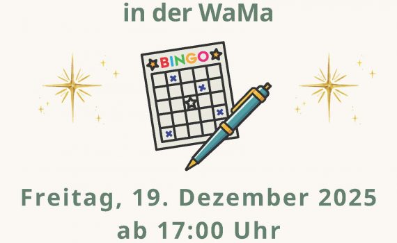 Dezember: Weihnachtlicher BINGO-Abend mit dem „Sirius-Treff“ Unser weihnachtlicher Bingo-Abend findet im Kiezladen WaMa (Ortolfstr. 206b) statt. Es gibt kleine Preise zu gewinnen! Die Teilnahme ist kostenfrei. Herzliche Einladung!