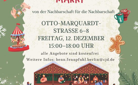 12. Dezember: Kiez-Weihnachtsmarkt im „Haus der Begegnung“ Kommt vorbei und genießt gemütliche Momente auf unserem Weihnachtsmarkt – von der Nachbarschaft für die Nachbarschaft. Wir freuen uns auf euch!