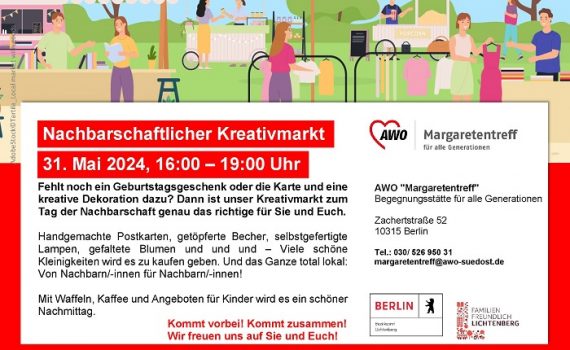 31. Mai: Kreativmarkt im „Margaretentreff“ Im Rahmen des „Tag des Nachbarn“ lädt unser „Margaretentreff“ in Lichtenberg am Freitag zum Kreativmarkt ein. Kommt gern vorbei und verbringt einen schönen Nachmitag unter Nachbarn/-innen!