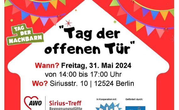 31. Mai: Tag der offenen Tür im „Sirius-Treff“ Am Freitag öffnet der „Sirius-Treff“ im Rahmen des „Tag des Nachbarn“ seine Türen für alle, die schon immer wissen wollten, was unsere Begegnungsstätte zu bieten hat und natürlich auch für alle, die schon längst Stammgäste sind. Herzlich willkommen!