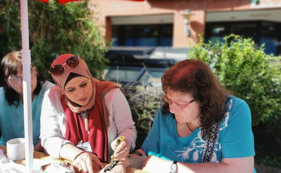 Lange Tafeln am „Mühlentreff“ Da waren sich alle einig: Es war ein durch und durch gelungenes Fest, das wir am 31. Mai anlässlich des „Tag der Nachbarschaft“ an der Neuköllner Jungfernmühle gefeiert haben! Zusammen mit weiteren 90 Organisationen in Neukölln hat sich der AWO „Mühlentreff“ gemeinsam mit dem Projekt „KlingelZeit“ (Neuköllner Engagementzentrum), den Stadtteilmüttern Neukölln, dem Waschhauscafé und dem Projekt „Lebendige Gropiusstadt“ am Aktionstag „Lange Tafeln Neukölln“ beteiligt. An insgesamt 19 Standorten verteilt auf den ganzen Bezirk Neukölln kamen Menschen zum Spielen, Diskutieren, Kreativsein und zum gemütlichen Kaffeekränzchen zusammen. Am Standort Jungfernmühle konnten unsere Besucher*innen Bingo spielen, basteln Pflanzen tauschen, sich mit Henna-Tattoos verzieren lassen und eine wunderbare Zaubershow von Malek Azar erleben, der im Mentoringprojekt des Kreisverbands als Mentor engagiert ist. Den perfekten Ausklang in den sommerlichen Abend haben uns die wunderbaren Chansons von Isabel Neuenfeldt und ihrem Akkordeon bereitet.