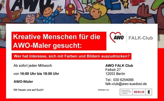 Immer mittwochs: AWO-Maler Unsere AWO-Maler suchen weitere kreative Menschen, die Lust haben, sich künstlerisch auszudrücken. Immer mittwochs, einfach vorbeikommen!