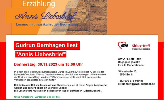 30. November: Lesung im „Siriustreff“ In einem alten reparaturbedürftigen Banjo wurde im Jahre 2018 ein über 70 Jahre alterLiebesbrief entdeckt. Welche Geschichte könnte sich dahinter verbergen? Warum wurdeder Brief in diesem Banjo versteckt? Warum wurde er nicht vernichtet, so wie es dieVerfasserin des Briefes gefordert hatte? Freuen Sie sich auf eine ganz besondere Lesung, musikalisch begleitet von Rudolf Bernhagen.