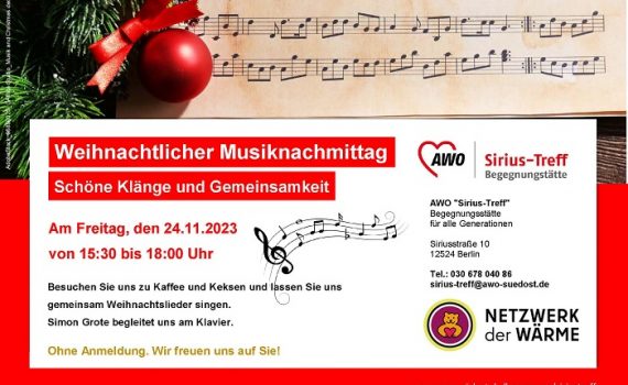 24. November: weihnachtliches Singen im „Siriustreff“ Besuchen Sie uns zu Kaffee und Keksen und lassen Sie uns gemeinsam Weihnachtslieder singen. Simon Grote begleitet uns am Klavier. Wir freuen uns auf Sie!