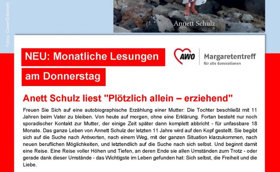 16. November: Lesung im „Margaretentreff“ Freuen Sie sich auf eine autobiographische Erzählung einer Mutter: Die Tochter beschließt mit 11 Jahren beim Vater zu bleiben. Von heute auf morgen, ohne eine Erklärung. Fortan besteht nur noch sporadischer Kontakt zur Mutter, der einige Zeit später dann komplett abbricht – für unfassbare 18 Monate. Das ganze Leben von Annett Schulz der letzten 11 Jahre wird auf den Kopf gestellt. Sie begibt sich auf die Suche nach Antworten, nach einem Weg, mit der ganzen Situation klarzukommen, nach neuen beruflichen Möglichkeiten, und letztendlich auf die Suche nach sich selbst. Wann? Donnerstag, 16. November 2023 um 18:00 Uhr Wo? AWO Margaretentreff | Zachertstraße 52 | 10315 Berlin Wir bitten um Anmeldung bis zum 14.11.2023 telefonisch: 030/ 526 950 31 oder per E-Mail: margaretentreff@awo-suedost.de