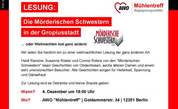 04. Dezember: „Mörderische Schwestern“ im „Mühlentreff“ Wir laden Sie herzlich ein zu einer weihnachtlichen Lesung der ganz anderen Art:Heidi Ramlow, Susanne Rüster und Connie Roters von den „Mörderischen Schwestern“ lesen Geschichten von Obdachlosen, sechs älteren Damen und einem sehr unerwünschten Besucher. Alle Geschichten sorgen für Heiterkeit, Spannung und Gänsehaut. Wann? 4. Dezember um 18:00 UhrWo? AWO „Mühlentreff“ | Goldammerstr. 34 | 12351 Berlin Wir bitten um Anmeldung!
