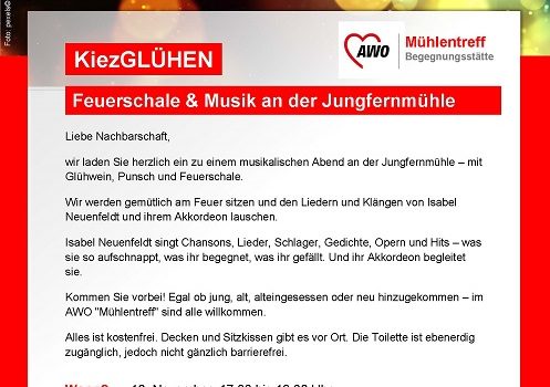 16. November: KiezGlühen im „Mühlentreff“ Unser AWO „Mühlentreff“ lädt herzlich ein zu einem musikalischen Abend an der Jungfernmühle – mit Glühwein, Punsch und Feuerschale. Wir werden gemütlich am Feuer sitzen und den Liedern und Klängen von Isabel Neuenfeldt und ihrem Akkordeon lauschen. Kommen Sie gern vorbei!
