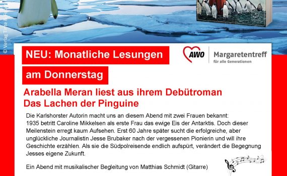 14. Dezember: Lesung im „Margaretentreff“ Arabella Meran liest aus ihrem Debütroman „Das Lachen der Pinguine“: 1935 betritt Caroline Mikkelsen als erste Frau das ewige Eis der Antarktis. Doch dieser Meilenstein erregt kaum Aufsehen. Erst 60 Jahre später sucht die erfolgreiche, aber unglückliche Journalistin Jesse Brubaker nach der vergessenen Pionierin und will ihre Geschichte erzählen. Freuen Sie sich auf eine musikalische Lesung, begleitet von Matthias Schmidt (Gitarre).