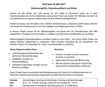 Raus aus der Krise Raus aus der Krise: Unser Familienzentrum Fennpfuhl bietet ein mehrwöchiges Coaching zum Thema Selbstwertbewußtsein, Körpergefühl und Stärke an. Anmeldungen sind möglich unter b.boller@pernaturacura.de