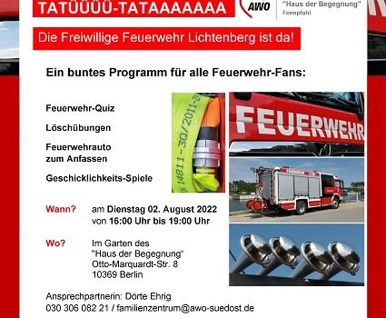 Die Freiwillige Feuerwehr im „Haus der Begegnung“ Ein buntes Programm für alle Feuerwehr-Fans erwartet euch am kommenden Dienstag, 02. August, im Garten des Haus der Familie Fennpfuhl. Herzlich willkommen!