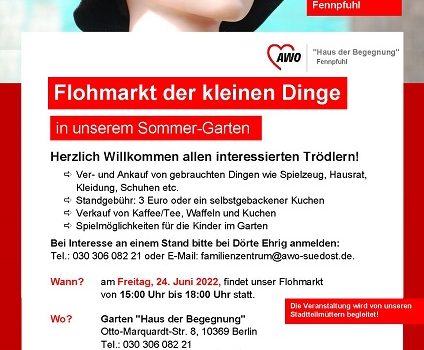 Flohmarkt im „Haus der Begegnung“ am 24. Juni Am Freitag, 24. Juni 2022, lädt unser Familienzentrum im „Haus der Begegnung Fennpfuhl“ ein zum „Flohmarkt der kleinen Dinge“, herzliche Einladung!