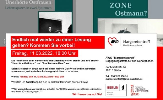 Einladung zur Lesung im „Margaretentreff“ Endlich mal wieder zu einer Lesung gehen? Kommen Sie vorbei! Die Autorinnen Ellen Händler und Ute Mitsching-Viertel stellen uns ihre Bücher „Unerhörte Ostfrauen“ und „Problemzone Mann“ vor. Seien Sie herzlich eingeladen bei einem kleinen Glas Wein und Knabbereien spannenden, ostdeutschen Lebensgeschichten zu lauschen.Wann? Freitag, den 11. März 2022 um 18:00 Uhr Wir bitten um Anmeldung bis zum 07.03.2022 telefonisch oder per E-Mail. ***Die Veranstaltung wird gemäß der aktuellen SARS-COV-Verordnung stattfinden, mindestens aber unter 3G – Bedingungen. ***