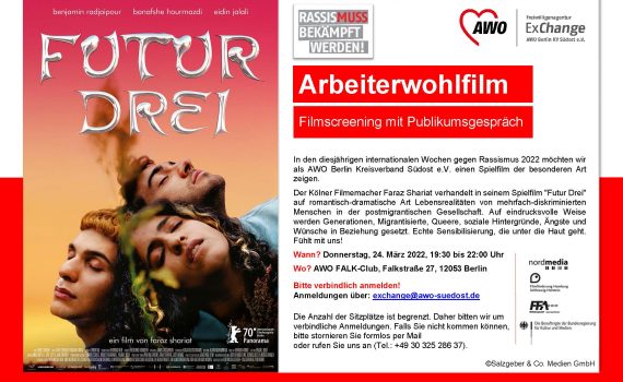 Arbeiterwohlfilm zeigt „Futur Drei“ Im Rahmen der diesjährigen Internationalen Wochen gegen Rassismus möchten wir als AWO Berlin Kreisverband Südost e.V. einen Spielfilm der besonderen Art zeigen. Der Köllner Filmemacher Faraz Shariat verhandelt in seinem Spielfilm „Futur Drei“ auf romantisch-dramatischer Art Lebensrealitäten von mehrfachdiskriminierten Menschen in der postmigrantischen Gesellschaft. Auf eindrucksvolle Weise werden Generationen, Migrantisierte, Queere, soziale Hintergründe, Ängste und Wünsche in Beziehung gesetzt. Echte Sensibilisierung, die unter die Haut geht. Fühlt mit uns! Bitte verbindlich anmelden Die Anzahl der Sitzplätze ist begrenzt. Daher bitten wir nur um verbindliche Anmeldungen. Falls Sie nicht kommen können, bitte stornieren Sie formlos per Mail, oder rufen Sie uns an (Tel.: +49 30 325 286 37). Anmeldungen über: exchange@awo-suedost.de Hintergrundinformationen zu Futur Drei: Parvis wächst als Kind der Millenial-Generation im komfortablen Wohlstand seiner Iranischen Einwanderer-Eltern auf. Dem Provinzleben in Hildesheim versucht er sich durch Popkultur, Grindr-Dates und Raves zu entziehen. Nach einem Ladendiebstahl leistet er Sozialstunden als Übersetzer in einer Unterkunft für Geflüchtete. Dort trifft er auf das iranische Geschwisterpaar Banafshe und Amon. Zwischen ihnen entwickelt sich eine fragile Dreierbeziehung, die zunehmend von dem Bewusstsein geprägt ist, dass ihre Zukunft in Deutschland ungleich ist. In seinem autobiographischen Regiedebüt erzählt Faraz Shariat, Jahrgang 1994, authentisch und zugleich wundersam überhöht vom queeren Heranwachsen eines Einwanderersohns in Deutschland – und liefert damit einen entschlossenen Gegenentwurf zu einem konventionellen deutschen Kino, in dem post-migrantische Erlebnisse und Geschichten von Einwanderern und ihrer Familien allzu oft ausgeschlossen oder misrepräsentiert werden. Für sein sensibles, pop-affines und kraftvolles Plädoyer für Diversität wurde „Futur Drei“ beim First Steps Award 2019 als Bester Spielfilm ausgezeichnet, Shariats junges Darsteller*innen-Ensemble (Banafshe Hourmazdi, Eidin Jalali, Benjamin Radjaipour) erhielt den Götz-George-Nachwuchspreis. Auf der Berlinale 2020, wo der Film im Panorama seine Weltpremiere feierte, wurde „Futur Drei“ mit zwei Teddys (Bester Spielfilm, Leser*innen-Preis) geehrt.