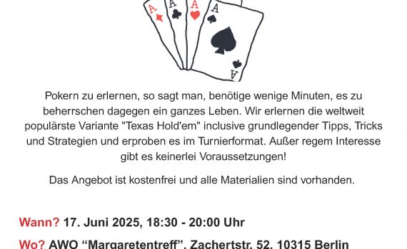 17. Juni: Pokern im „Margaretentreff“ Ihr wolltet schon immer mal in die Welt des Pokerns reinschnuppern? Im „Margaretentreff“ erlernt ihr die weltweit populärste Variante „Texas Hold’em“ inklusive grundlegender Tipps, Tricks und Strategien und erprobt es im Turnierformat. Klingt spannend? Dann meldet euch gleich an!