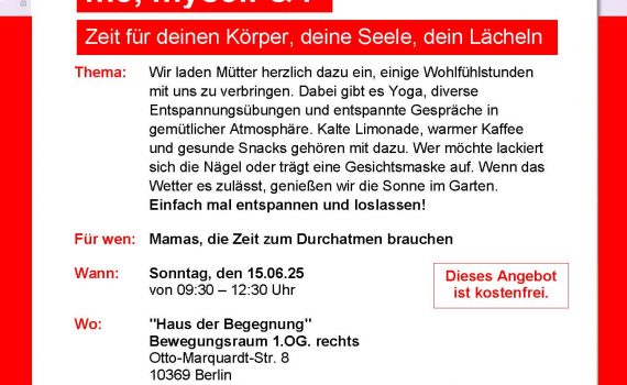 15. Juni im Familienzentrum Fennpfuhl: Entspannung für Mütter Am 15. Juni laden wir Mütter dazu ein, einige Wohlfühlstunden bei uns im Familienzentrum Fennpfuhl zu verbringen.