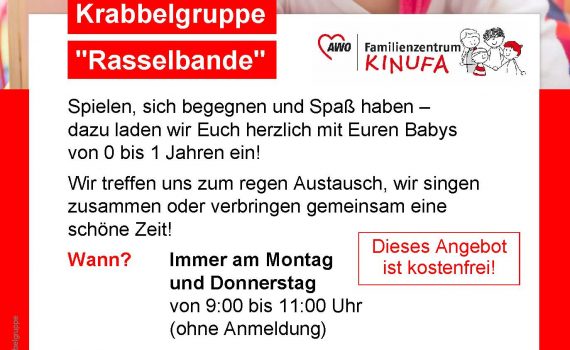 Immer montags und donnerstags: Krabbelgruppe im KINUFA Liebe Eltern und Babys, sucht ihr nach einem Ort, um euch mit anderen Eltern auszutauschen und gemeinsam schöne Momente mit euren Kleinen zu erleben?Dann seid ihr herzlich eingeladen zu unserer offenen Krabbelgruppe! Wir treffen uns montags und donnerstags zwischen 9:00 und 11:00 Uhr im Familienzentrum KinuFa, Charlottenstraße 3, 10315 Berlin. Hier können eure Babys spielen, lachen und neue Freunde finden – und ihr könnt nette Gespräche mit anderen Eltern führen und euch austauschen. Wir freuen uns auf neue kleine und große Krabbler*innen! Kommt vorbei und verbringt eine schöne Zeit mit uns! Bei Fragen meldet euch gern per Mail, Telefon, Signal-Nachricht oder SMS.