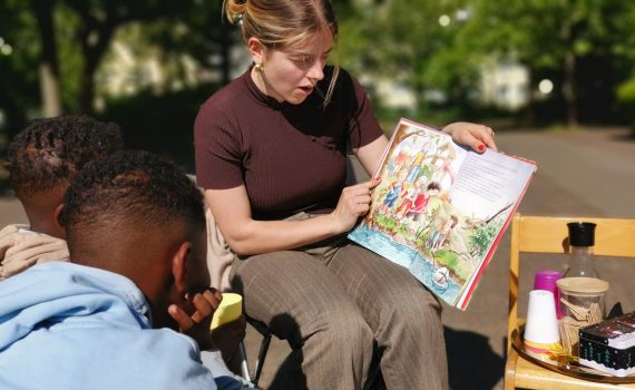 Buch trifft Ohr: neues Angebot im Familienzentrum Fennpfuhl Seit Mai wird das Familienzentrum durch ein neues Angebot bereichert:In Kooperation mit dem AWO Landesjugendwerk wird wöchentlich aus verschiedensten Büchern zu wichtigen Themen für kleine (und auch große) Leute vorgelesen und ein Gesprächsrahmen für Kinder sowie Eltern dazu geschaffen. In den Büchern geht es z.B. um Freundschaft, Diversität, wie es ist, in ein anderes Land zu ziehen, Trennung von Eltern, verschiedene Arten von Familien, was eigentlich Demokratie bedeutet, wie man sich gegen Ungerechtigkeiten stark macht und wie man mit Wut und Sorgen umgehen kann. Unser Auftakt fand bei schönem Frühlingswetter draußen vor dem Haus der Begegnung statt und war gleich ein voller Erfolg – wir freuen uns schon auf die Fortsetzungen! Immer mittwochs um 16:00 Uhr!