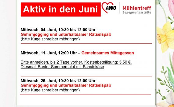 23.Mai: Tag des Nachbarn im „Margaretentreff“ Am 23. Mai feiern wir im AWO „Margaretentreff“ den „Tag der Nachbarschaft“. Ihr seid herzlich eingeladen zu Pflanzentauschbörse, frischen Waffeln und kreativen Angeboten. Wir freuen uns auf euch!