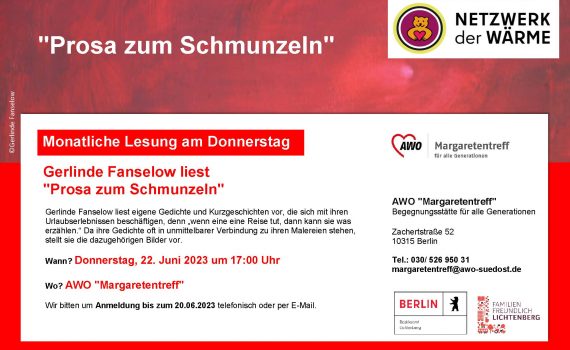 22. Juni: Lesung im Margaretentreff „Prosa zum Schmunzeln“ erleben Sie am 22. Juni in unserer Begegnungsstätte „Margaretentreff“. Gerlinde Fanselow liest eigene Gedichte und Kurzgeschichten vor, die sich mit ihren Urlaubserlebnissen beschäftigen. Herzliche Einladung! Die Veranstaltung findet im Rahmen des „Netzwerk der Wärme“ statt.