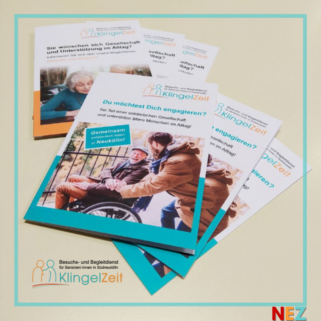 Im August 2021 startete das Neuköllner EngagementZentrum (NEZ) das neue FEIN-Mittel Pilotprojekt „KlingelZeit“. Hierbei handelt es sich um einen Besuchs- und Begleitdienst für Senioren/-innen, bei dem Patenschaften für Freizeitaktivitäten und kleinere Hilfeleistungen im Alltag vermittelt werden. Der Projektraum für „KlingelZeit“ liegt in Süd-Neukölln außerhalb der Quartiersmanagementgebiete.