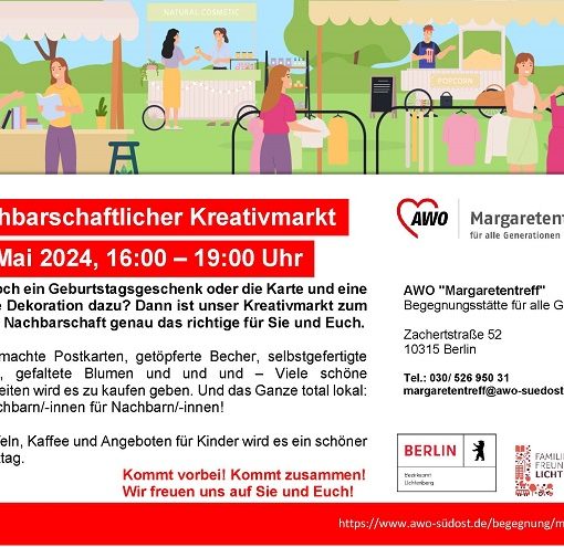 31. Mai: Kreativmarkt im „Margaretentreff“ Im Rahmen des „Tag des Nachbarn“ lädt unser „Margaretentreff“ in Lichtenberg am Freitag zum Kreativmarkt ein. Kommt […]